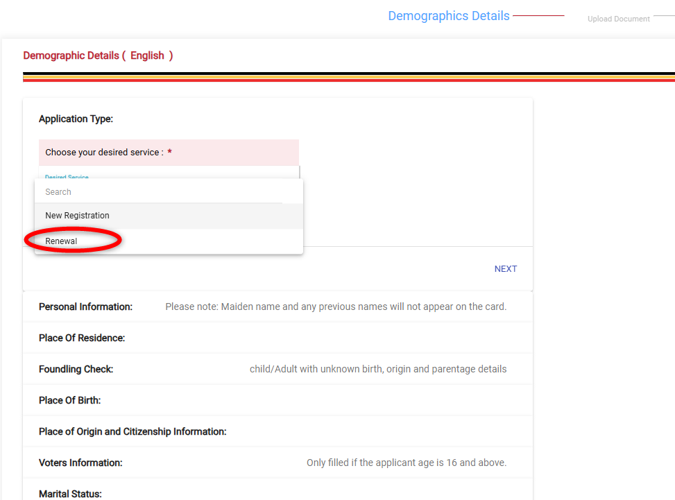 Fill out your name, national ID number, email address, phone number, and other details from your expired/expiring national ID and click on “Next.”