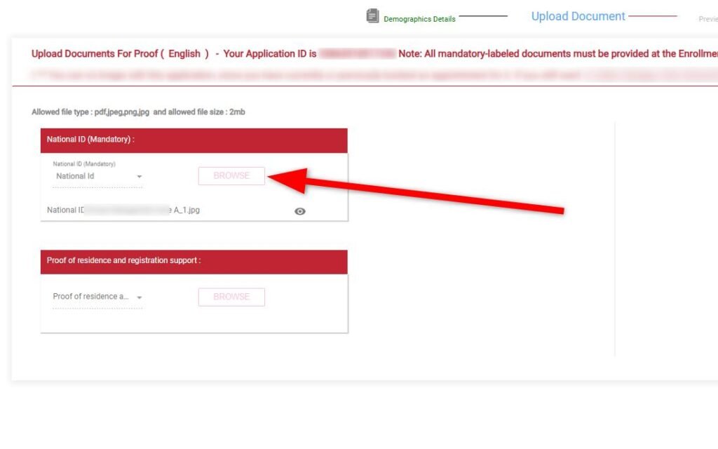 Click “Browse” next to National ID box. Locate the digital image of your national ID card on your computer storage and click it to upload. Then click “Continue.”
