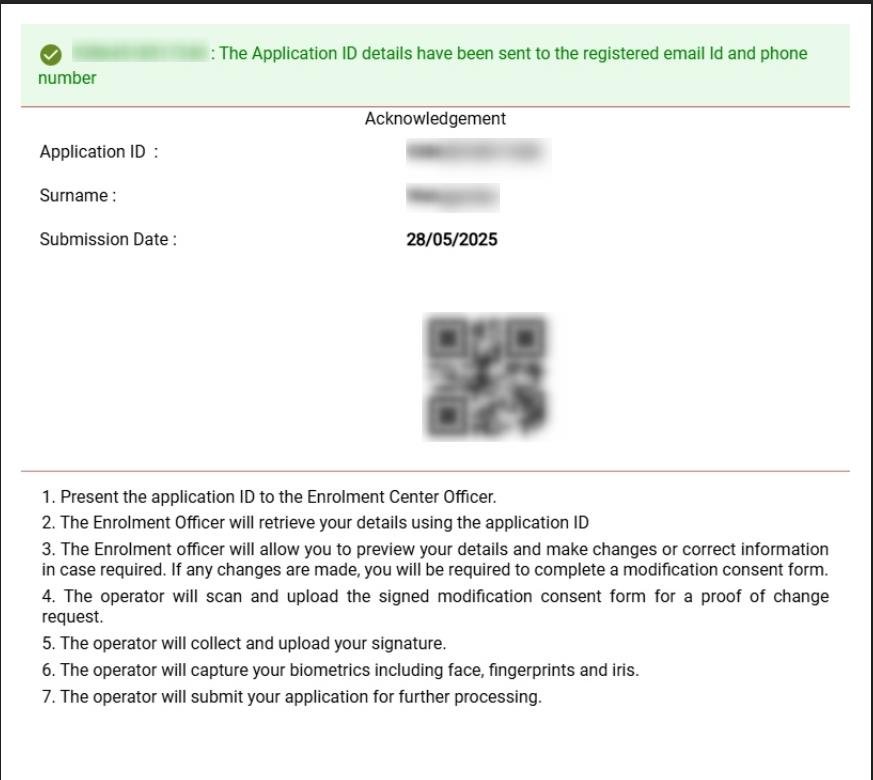 The system will generate your application ID along with a summary of your name and address information. NIRA will also send a text message to your phone number, showing your application ID. Click OK to confirm.